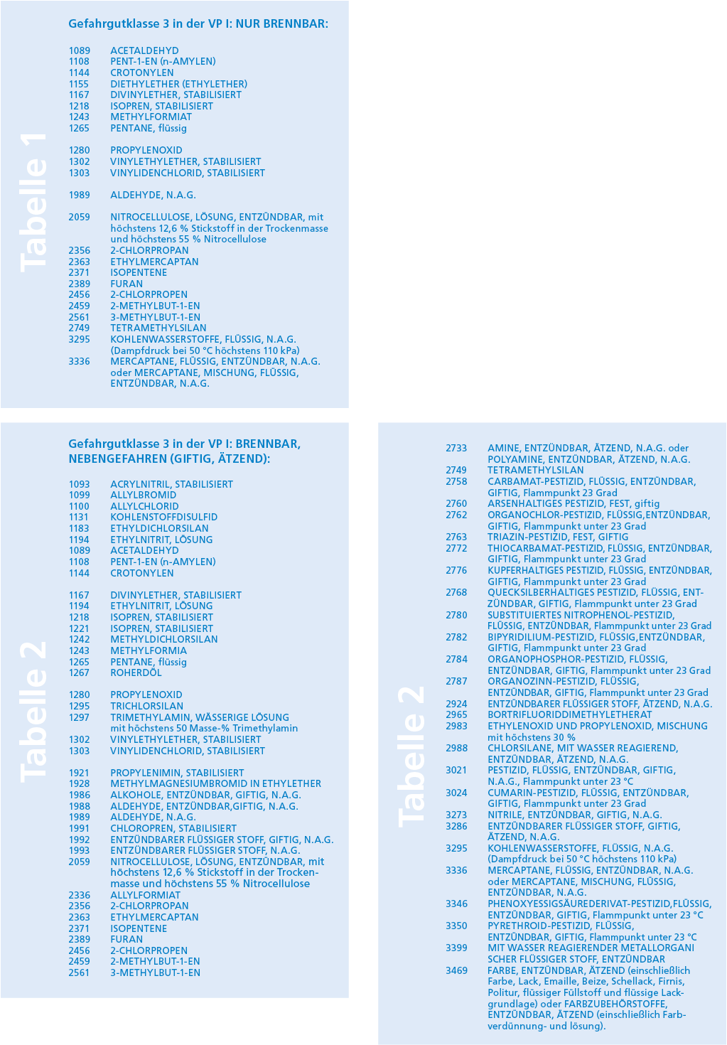 - brennbare Flüssigkeiten der ADR-Klasse 4.2 („Selbstentzündliche Stoffe“), 4.3 („Stoffe, die in Berührung mit Wasser entzündliche Gase entwickeln“) und 5.2 („Organische Peroxide“) ADR = Übereinkommen über die internationale Beförderung gefährlicher Güter auf der StraßeVP = Verpackungsgruppe